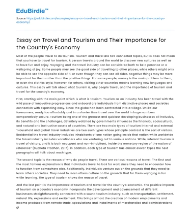 Most of the people travel to do tourism. Tourism and travel are two connected topics, but is does not mean that you have to travel for tourism. A person travels around the world to discover new cultures as well as to have fun and enjoy. Voyaging and the travel industry can be considered both to be a penance or a wellspring of joy. Some people may see the good side of travelling to other places, while others might only be able to see the opposite side of it, or even though they can see all sides, negative things may be more important for them rather than the positive things. For some people, money is the main problem to them, or even the clothes style; however, for others, visiting other countries means learning new languages and cultures. This essay will talk about what tourism is, why people travel, and the importance of tourism and travel for the country's economy.