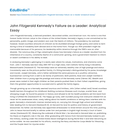 In analyzing Kennedy’s upbringing it is easily seen where his values, motivations, and charisma come from. John F. Kennedy was born May 29th 1917 to a high class, Irish Catholic family living in Brookline, Massachusetts (Hackwork 6). The Kennedys were an extremely wealthy clan of high prestige and status. Consistently seen as the picture perfect family, it’s fitting Kennedy’s distinguished by his poise, knowledge and morals. Joseph Kennedy, John’s father exhibited the same persona as a youthful, attractive, businessman coming from a well to do family of politicians. Both parents, Rose and Joseph instilled in their children from a young age the prestige and status of the Kennedy name (Obrien 36). Wealth and power were rooted in their eight children as their parents pushed them to their fullest capabilities, giving them the greatest opportunities to succeed and to uphold the family legacy.