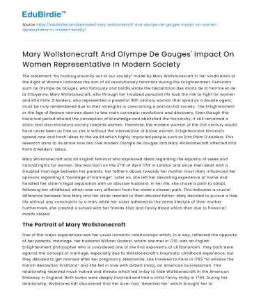 The statement “by hunting sincerity out of our society” made by Mary Wollstonecraft in her Vindication of the Right of Woman indicates the aim of all revolutionary feminists during the Enlightenment. Feminists such as Olympe de Gouges, who famously and boldly wrote the Déclaration des droits de la Femme et de la Citoyenne, Mary Wollstonecraft, who through her troubled personal life took the risk to fight for women and Etta Palm D’Aelders, who represented a powerful 18th century woman that spied as a double agent, must be truly remembered due to their strengths in overcoming a patriarchal society. The Enlightenment or the Age of Reason narrows down to two main concepts: revolutions and discovery. Even though this historical period altered the conception of knowledge and abolished the monarchy, it still remained a static and discriminatory society towards women. Therefore, the modern woman of the 21st century would have never been as free as she is without the intervention of brave women. Enlightenment feminists spread new and fresh ideas to the world which highly impacted people such as Etta Palm D’Aelders. This research aims to illustrate how two role models Olympe de Gouges and Mary Wollstonecraft affected Etta Palm D’Aelders’ ideas.