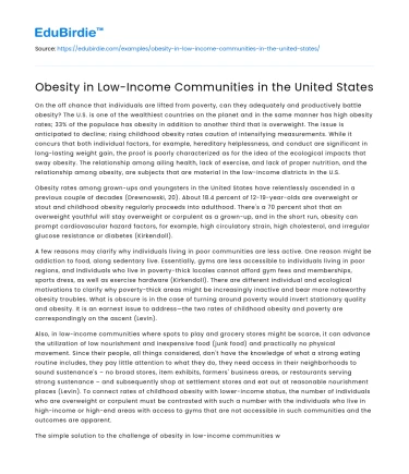 On the off chance that individuals are lifted from poverty, can they adequately and productively battle obesity? The U.S. is one of the wealthiest countries on the planet and in the same manner has high obesity rates; 33% of the populace has obesity in addition to another third that is overweight. The issue is anticipated to decline; rising childhood obesity rates caution of intensifying measurements. While it concurs that both individual factors, for example, hereditary helplessness, and conduct are significant in long-lasting weight gain, the proof is poorly characterized as for the idea of the ecological impacts that sway obesity. The relationship among ailing health, lack of exercise, and lack of proper nutrition, and the relationship among obesity, are subjects that are material in the low-income districts in the U.S.