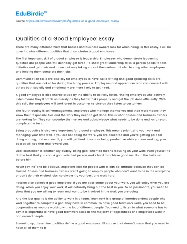 There are many different traits that bosses and business owners look for when hiring. In this essay, I will be covering nine different qualities that characterize a good employee.
