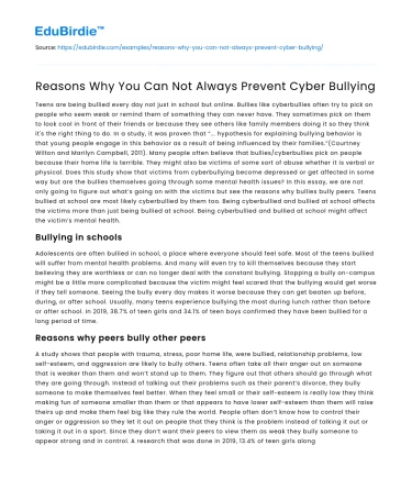 Teens are being bullied every day not just in school but online. Bullies like cyberbullies often try to pick on people who seem weak or remind them of something they can never have. They sometimes pick on them to look cool in front of their friends or because they see others like family members doing it so they think it's the right thing to do. In a study, it was proven that “... hypothesis for explaining bullying behavior is that young people engage in this behavior as a result of being influenced by their families.”(Courtney Wilton and Marilyn Campbell, 2011). Many people often believe that bullies/cyberbullies pick on people because their home life is terrible. They might also be victims of some sort of abuse whether it is verbal or physical. Does this study show that victims from cyberbullying become depressed or get affected in some way but are the bullies themselves going through some mental health issues? In this essay, we are not only going to figure out what’s going on with the victims but see the reasons why bullies bully peers. Teens bullied at school are most likely cyberbullied by them too. Being cyberbullied and bullied at school affects the victims more than just being bullied at school. Being cyberbullied and bullied at school might affect the victim’s mental health.