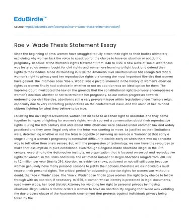 Since the beginning of time, women have struggled to fully attain their right to their bodies ultimately explaining why women lack the voice to speak up for the choice to have an abortion or not during pregnancy. Because of the Women’s Rights Movement from 1848 to 1920, a new wave of social awareness was fostered as women fought for civil rights and women are learning to fight back and defend their rights to their bodies. Since its founding in 1920, the American Civil Liberties Union has recognized that a woman’s right to privacy and her reproductive rights are among the most important liberties that women have gained. The infamous case “Roe v. Wade” was a pivotal moment in the history of women’s abortion rights as women finally had a choice in whether or not an abortion was an ideal option for them. The Supreme Court invalidated the law on the grounds that the constitutional right to privacy encompasses a woman's decision whether or not to terminate her pregnancy. As our nation progresses towards embracing our civil liberties, abortion is still a very prevalent issue within legislation under Trump’s reign, especially due to very conflicting perspectives on the controversial issue, and the union of like-minded citizens fighting for what they believe to be true.