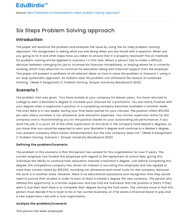 The paper will examine the problem and evaluate the issue by using the six-step problem-solving approach. The assignment is asking what you are doing when you are faced with a question. When are you going to fix it and what steps have you taken to ensure that it is properly resolved? The six methods for problem-solving will be applied to scenario 1 in this task. Where a person has to make a difficult decision between changing his job to increase his finances immediately, or staying where he is currently working, which may allow him to continue his education along with financial support from the employer. This paper will present a synthesis of all relevant ideas on how to solve the problem in Scenario 1, using a six-step systematic approach. As Voltaire said, 'No problem can withstand the assault of sustained thinking.' [Week 9 Assignment 2: Problem Solving. Strayer University Blackboard 2020]