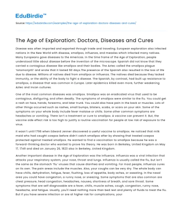 Disease was often imported and exported through trade and traveling. European exploration also infected nations in the New World with disease, smallpox, influenza, and measles which infected many natives. Many Europeans gave diseases to the Americas. In the time frame of the Age of Exploration, people understood little about disease before the invention of the microscope. Spanish did not know that they carried a contagious disease like smallpox and their bodies. The Aztec called the smallpox plague ‘totomonjztli’ and wrote that it lasted 60 days.The presence of the Spanish also resulted in the loss of life due to disease. Millions of natives died from smallpox or influenza. The natives died because they lacked immunity, or the ability of the body to fight a disease. The Spanish, by contrast, had built up resistance to smallpox, a disease that was common in Europe. Later epidemics killed even more, further weakening Aztec and Incan cultures.