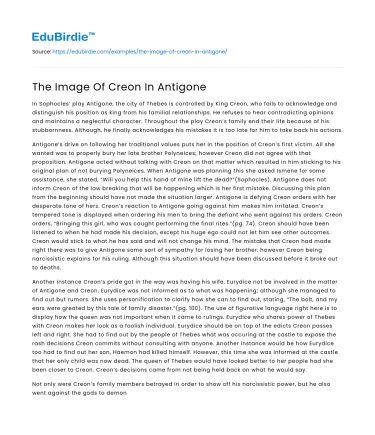 Overall, Creon’s huge ego got in the way of making decisions he thought was the best for the people of Thebes. However, Creon’s narcissistic side is shown throughout the play to demonstrate his inability to lawfully run as the monarch.